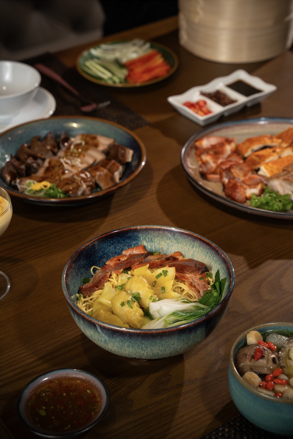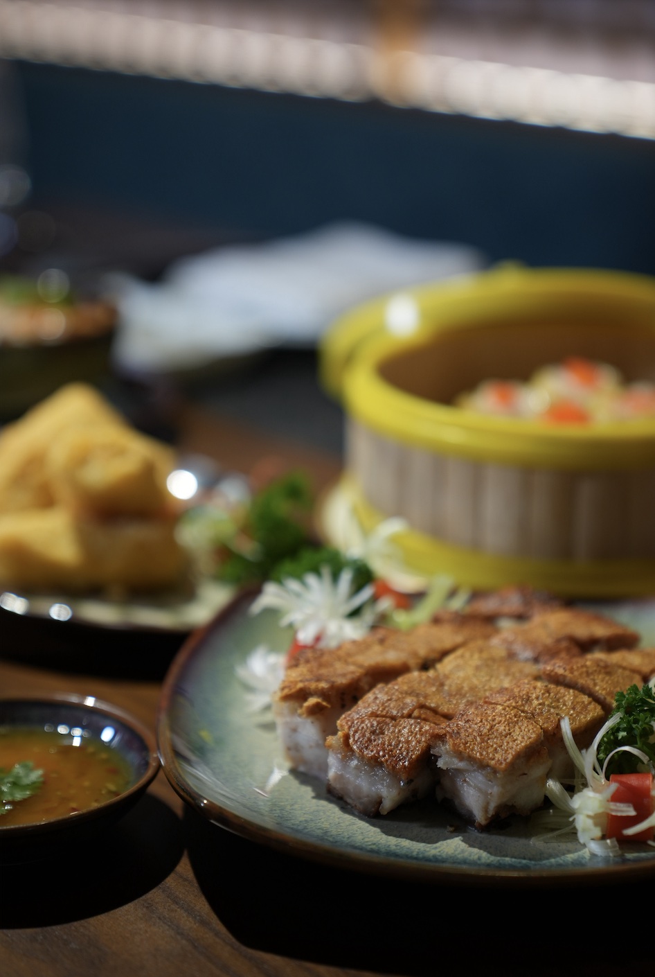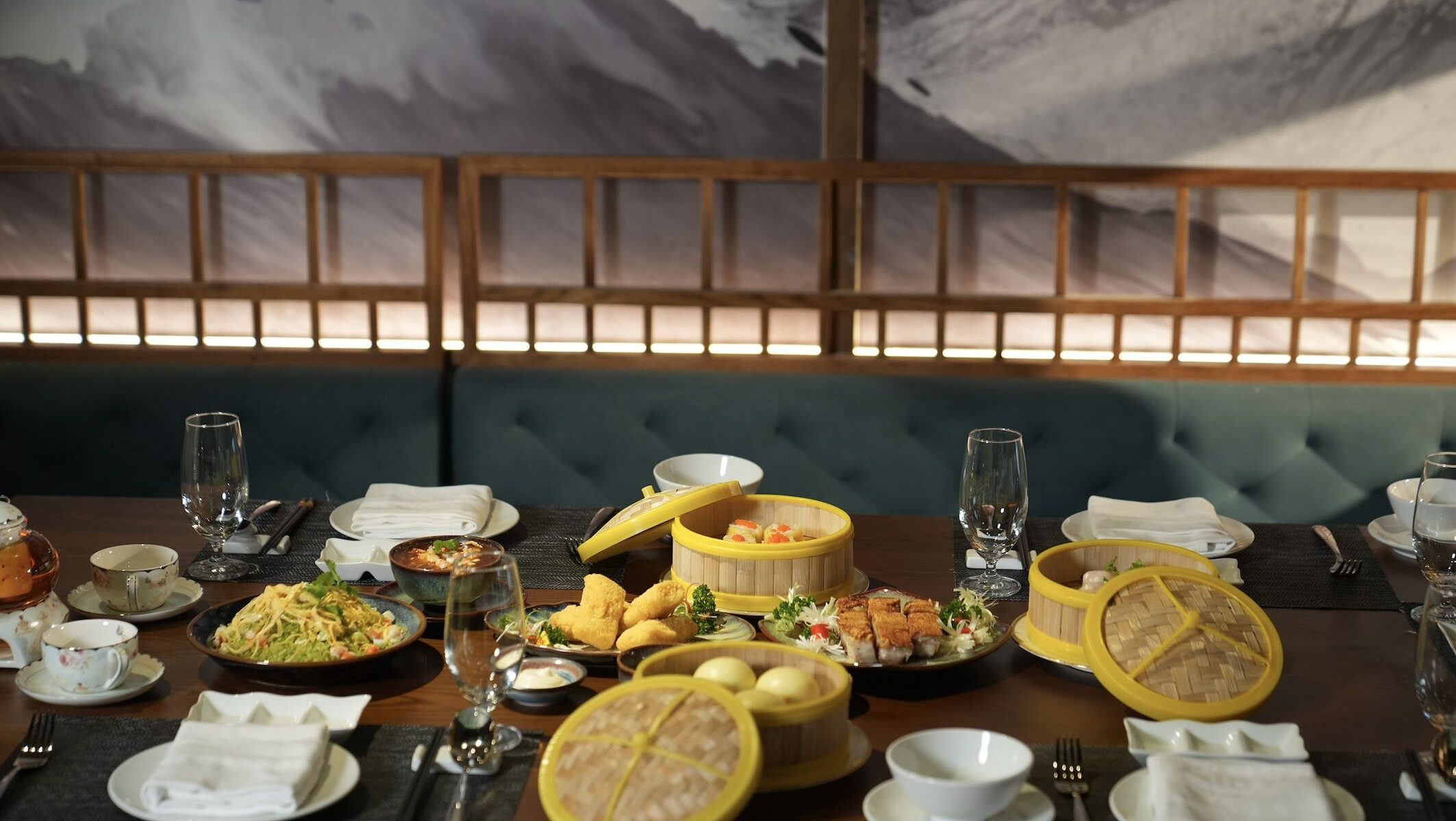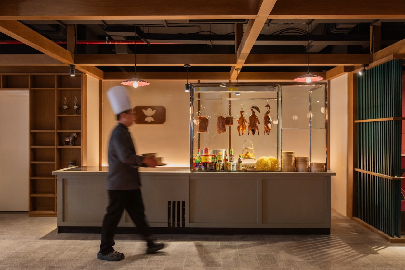 Trung tâm của trải nghiệm là bếp mở – một “sân khấu ẩm thực” nơi những món ăn trứ danh được chế biến đầy nghệ thuật: vịt quay Bắc Kinh nướng trên củi vải, thịt heo quay giòn rụm, và những chiếc há cảo được gói thủ công, tươi mới theo từng đơn đặt hàng. Thực đơn tôn vinh ẩm thực miền Nam Trung Hoa với các món dim sum tinh tế, cơm chiên đậm đà và quầy lẩu cá nhân, cho phép thực khách tự do chọn nước dùng và nguyên liệu tươi ngon theo sở thích – tạo nên một hành trình ẩm thực độc đáo, mang đậm dấu ấn riêng.