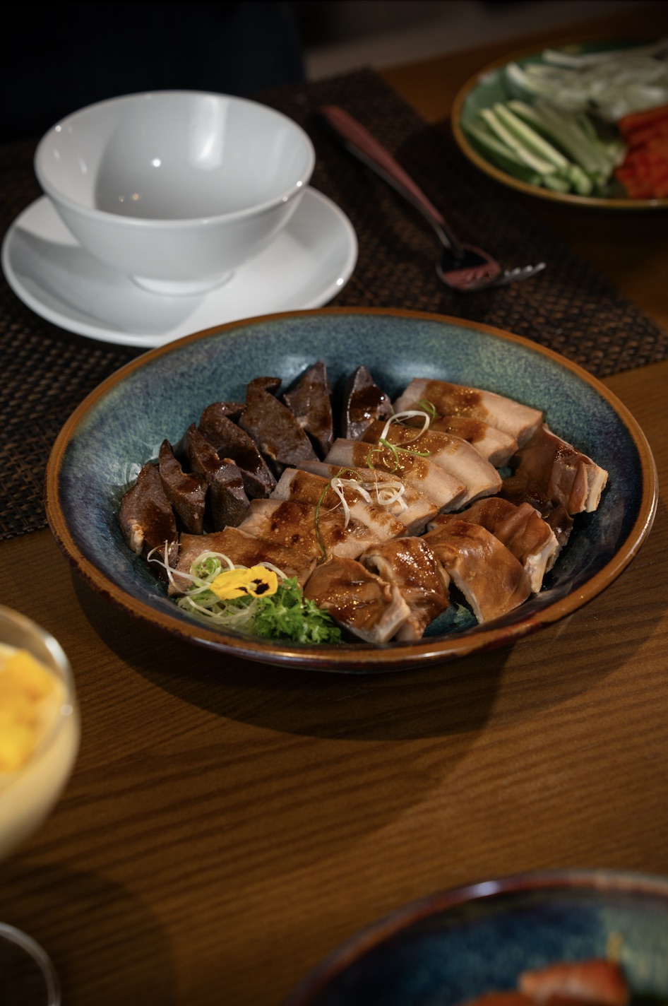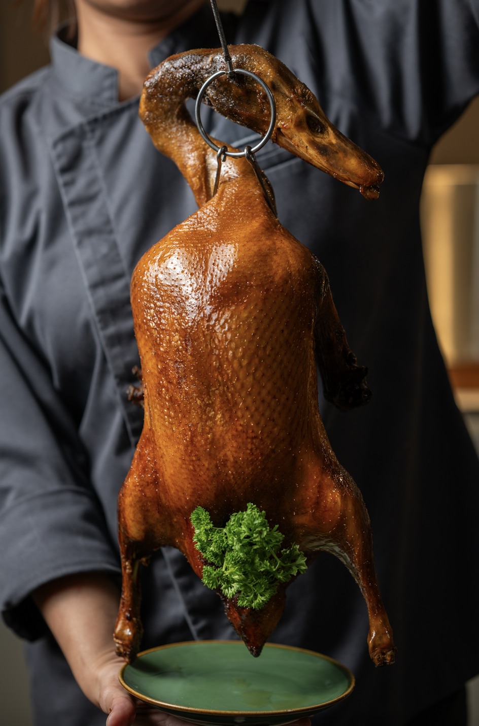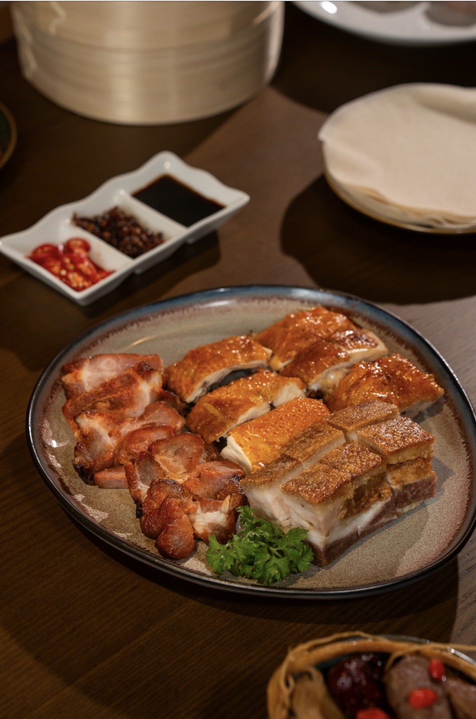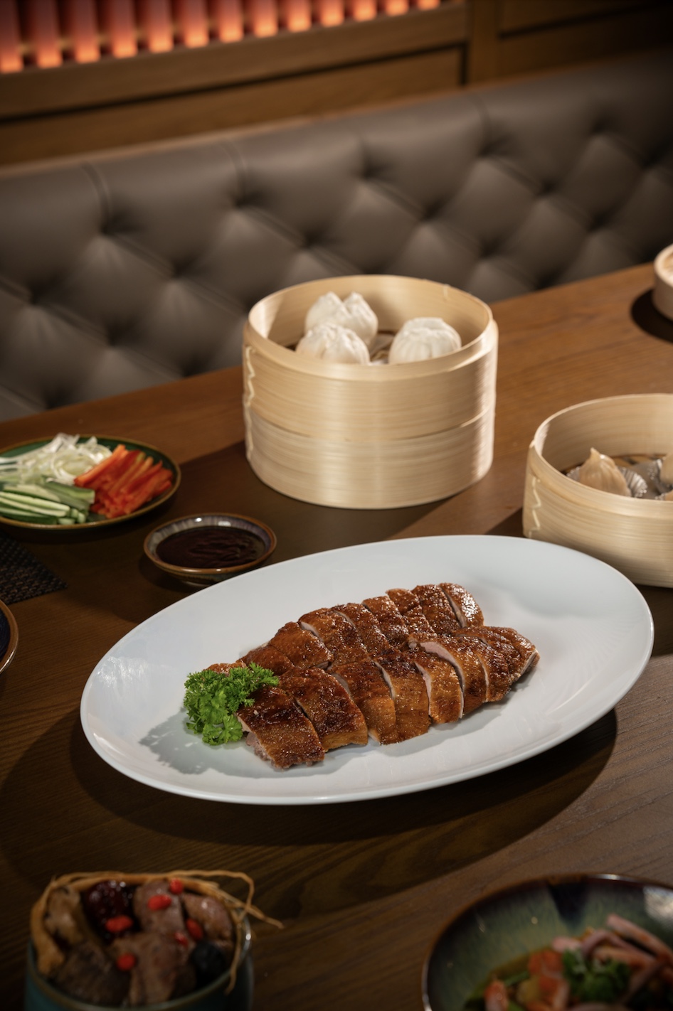 Trung tâm của trải nghiệm là bếp mở – một “sân khấu ẩm thực” nơi những món ăn trứ danh được chế biến đầy nghệ thuật: vịt quay Bắc Kinh nướng trên củi vải, thịt heo quay giòn rụm, và những chiếc há cảo được gói thủ công, tươi mới theo từng đơn đặt hàng. Thực đơn tôn vinh ẩm thực miền Nam Trung Hoa với các món dim sum tinh tế, cơm chiên đậm đà và quầy lẩu cá nhân, cho phép thực khách tự do chọn nước dùng và nguyên liệu tươi ngon theo sở thích – tạo nên một hành trình ẩm thực độc đáo, mang đậm dấu ấn riêng.